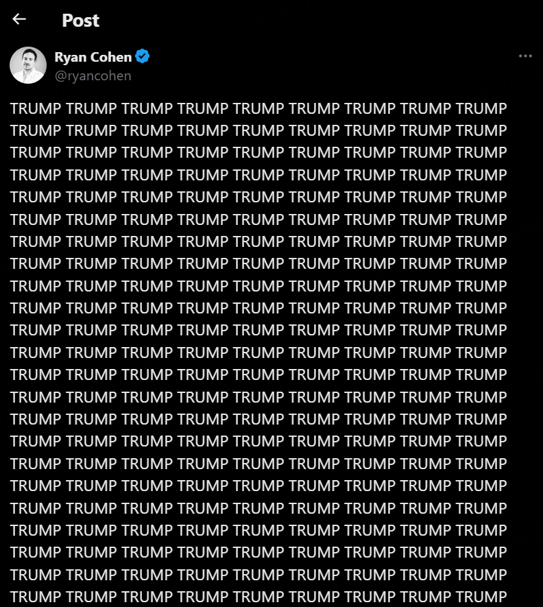 CEO Ryan Cohen在X上打了665次“TRUMP”