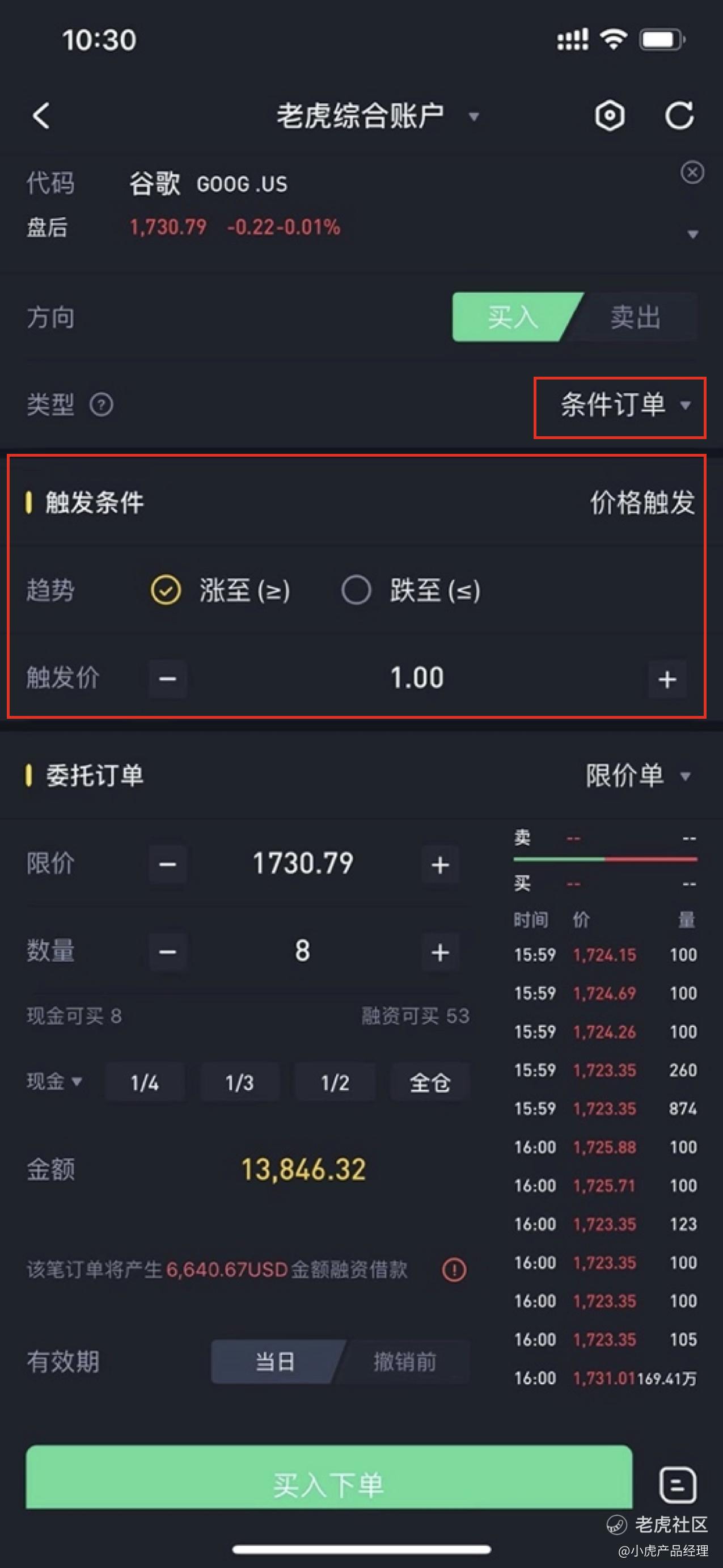 -现综合账户用户可以在下单时候选择订单类型为“条件订单”,并预设触发条件后完成条件订单的下单。