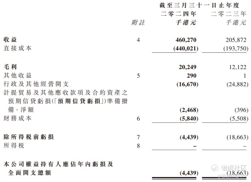 据智通财经APP了解,财报数据显示,近年来公司业绩乏善可陈,尽管收入有所增长,但仍然未能走出亏损。截至2024年3月31日止年度,公司收益为4.60亿港元,相比去年同期的2.06亿港元增长123.6%;净亏损443.9万港元,相比去年同期的1870万港元收窄76.2%。公司权益持有人应占每股基本及摊薄亏损约为0.92港仙。