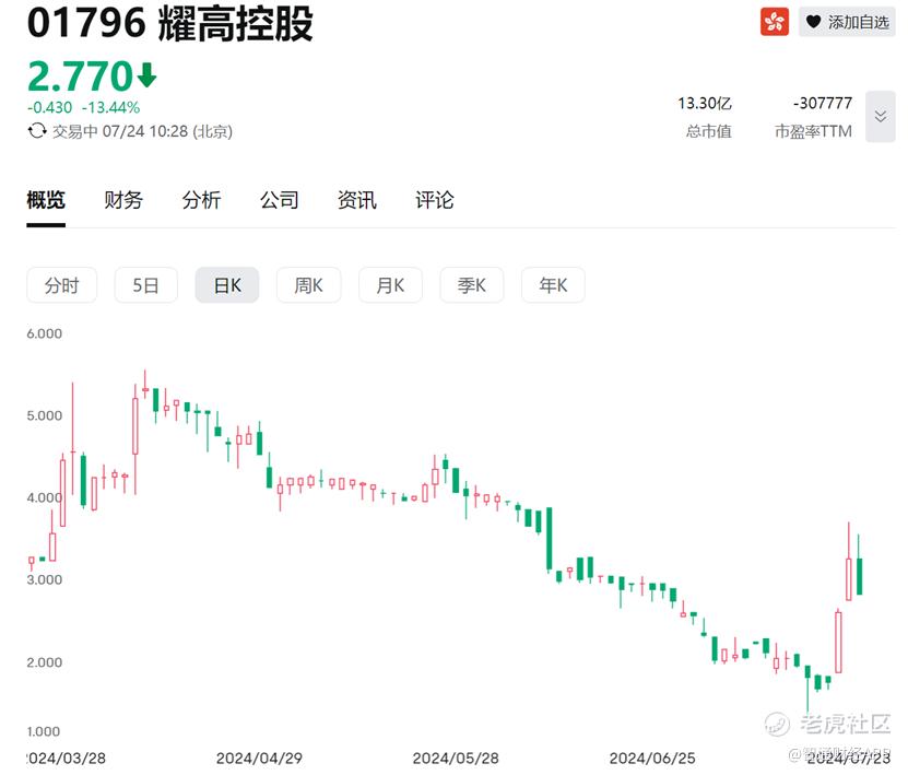 股价向下运行三个月后,近日$耀高控股(01796)$ 再度走妖:7月22日与23日两个交易日内分别上涨50%与25.49%,目前3.2港元的股价已较前几日的阶段性低点1.26港元反弹超154%。
