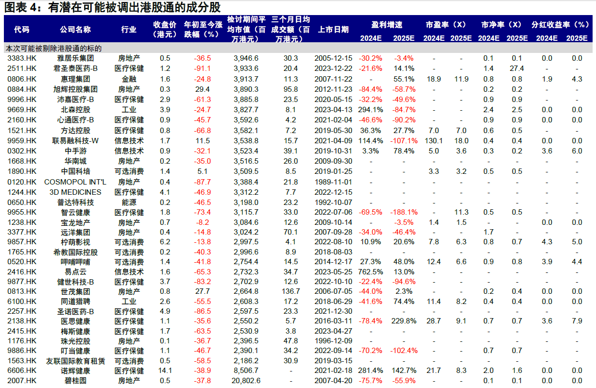 四、可能被移出港股通的公司 同时,预计有33家公司可能因市值下降、流动性不足或违反相关规定而被移出港股通,包括: