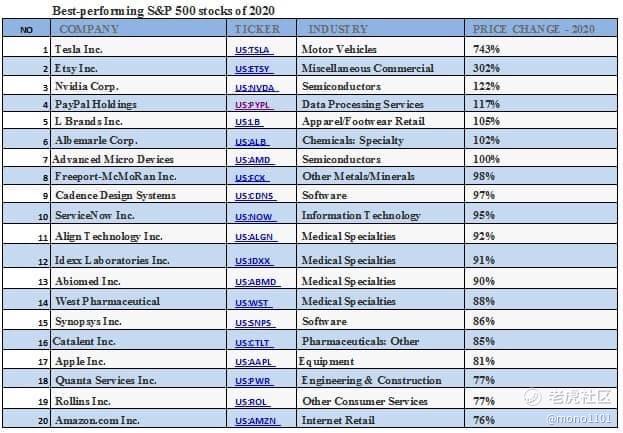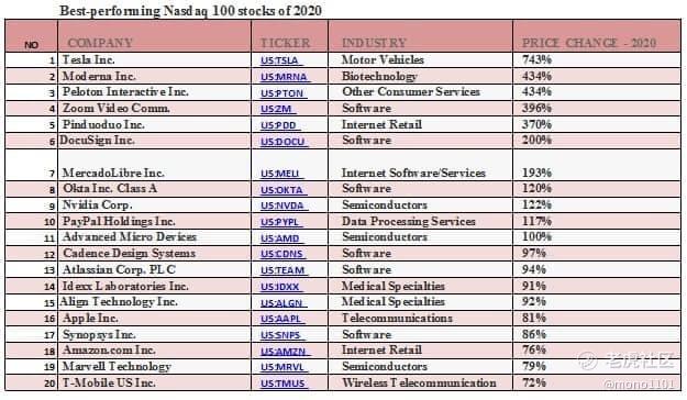 NASDAQ 的表现居冠12,888点创下43%涨幅。100家成份股中最大涨幅5家为Tesla 743%, Moderma 434%,