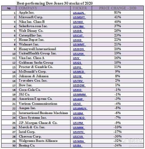2020年道琼斯工业指数写下历史新高30,606点 全年表现7.25%,30家成份股中最大涨幅5家为Apple 81%,
