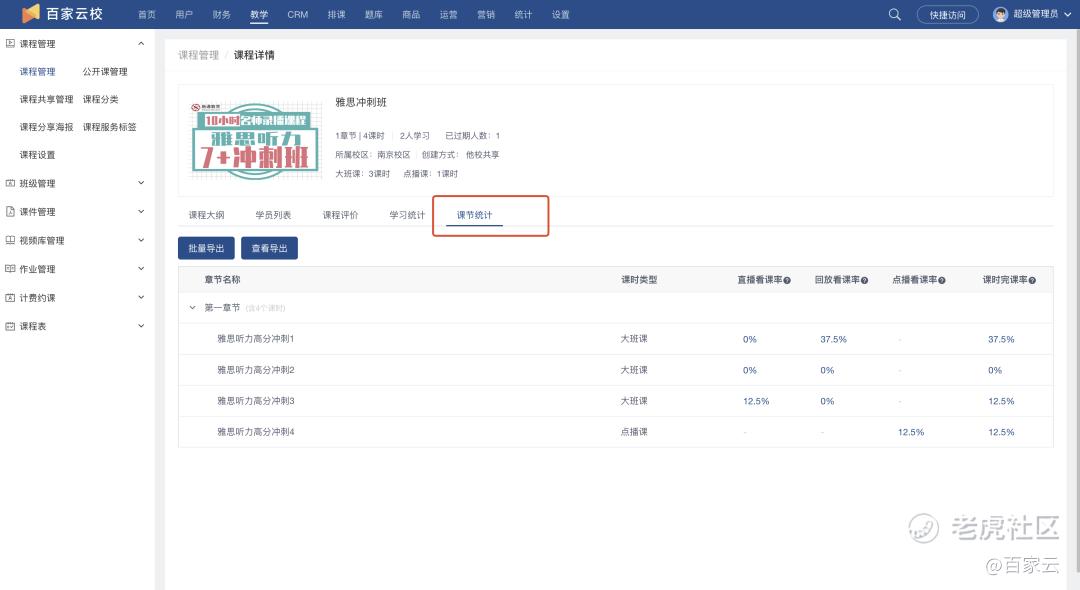 以课时为维度,百家云校新版本增加了课时看课率和完课率统计指标,可帮助教师和管理员快速掌握每个课时的学习热度和完成度。这些数据有助于教师评估教学效果、调整教学进度和难度;同时也为学员提供了自我评估的依据,让他们能够更清晰地了解自己的学习进度和成果。