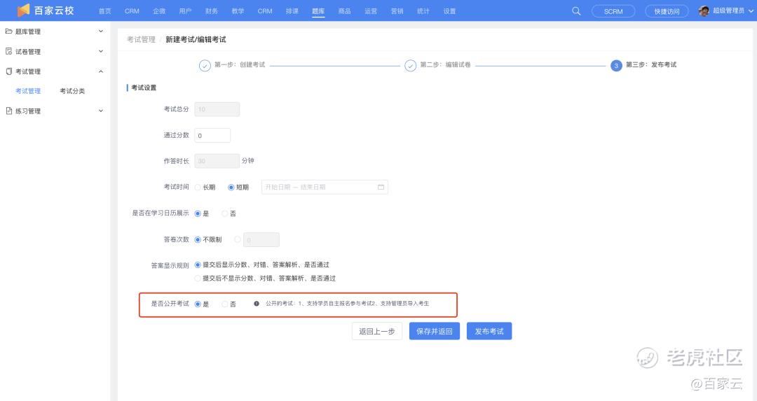 面对多样化的学习需求,百家云校在考试模式上进行了更多创新。「公开考试」允许大范围的学生参与测验,便于教师了解整体学习水平;「内部考试」则适用于小范围的模考或专项训练,有助于学员查漏补缺。