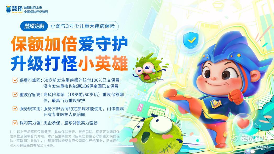 7月26日,慧择联袂招商仁和人寿定制推出小淘气3号少儿重大疾病保险。据了解,为积极响应党的二十届三中全会关于民生领域改革的重要部署,小淘气3号在延续慧择定制产品高性价比、全面保障等传统优势的基础上,专属定制高风险年龄重疾保额翻倍,60岁未发生重疾还能通过减保拿回已交保费等创新设计,既满足新生代宝妈宝爸在高质量育儿理念下对孩子保障品质日益升级的需求,也兼顾降低家庭养育成本。而且,小淘气3号的承保保司为招商仁和人寿,背靠其招商局、中国移动、中国航信三大央企股东,可以助力宝妈宝爸在不确定的周期波动中规划孩子未来时更加笃定和安心。