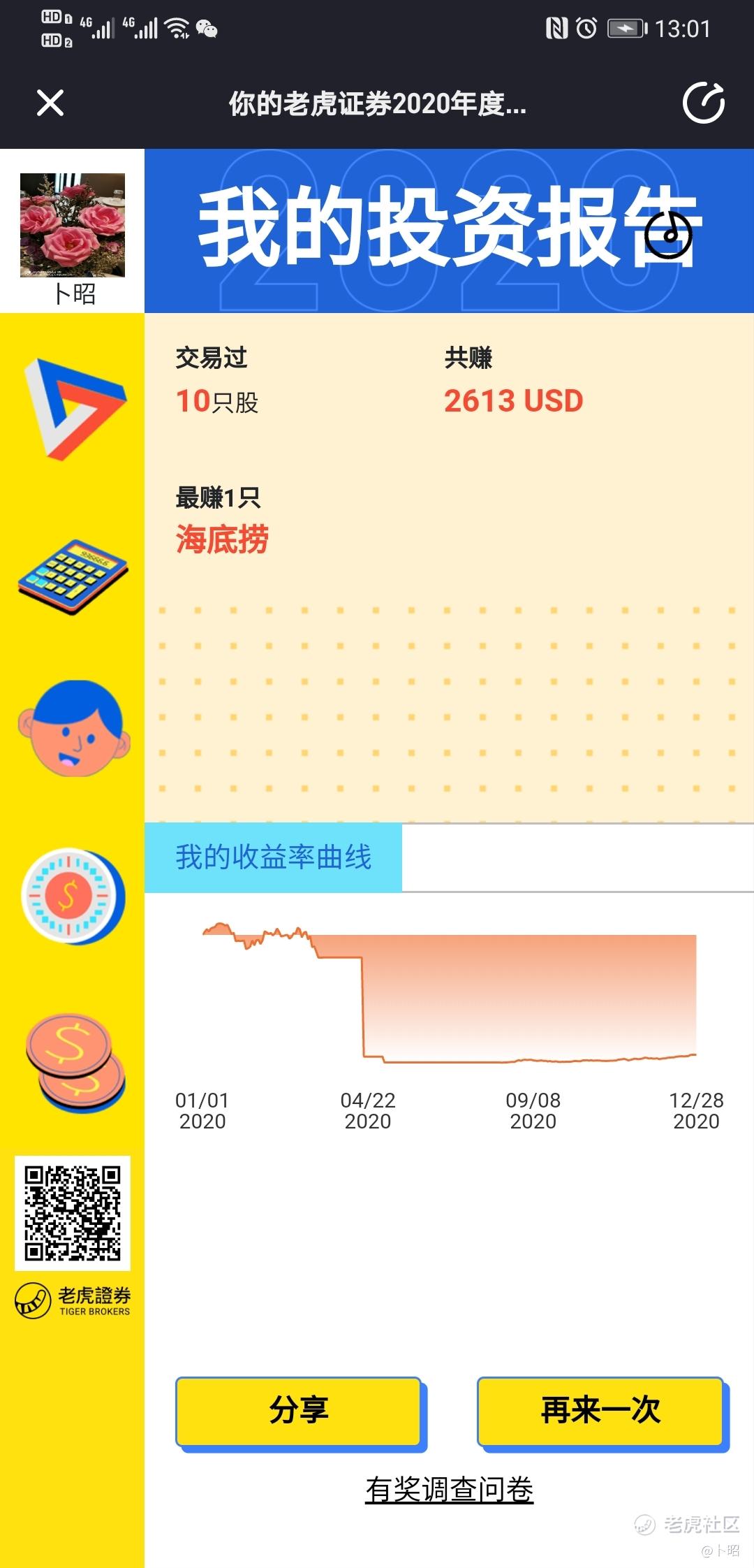 今年还是小有收获的,2020年大家都经历了很多,活下去是2020年的主要目标,21年再求发展吧。不管怎么样,我们都过来了,祝老虎证券越来越好,祝大家越来越好。