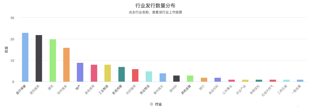 今年发行最多的板块是医疗、居民服务(包含物业)、建筑,按行业分类的累计收益来看,从高到低依次是医疗、建筑、软件。