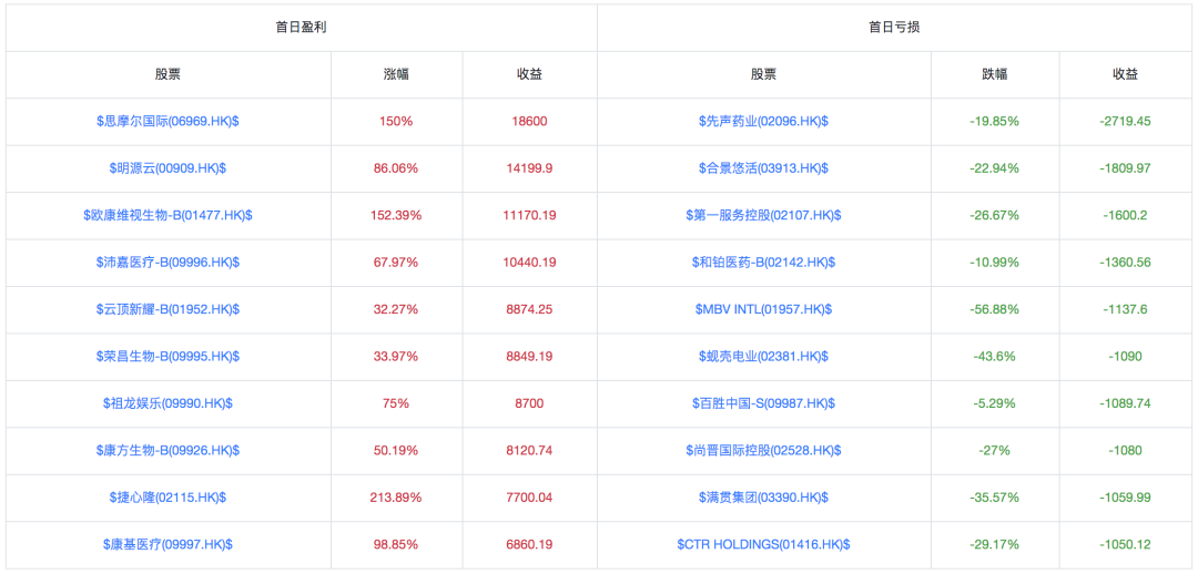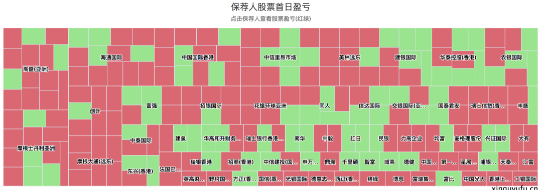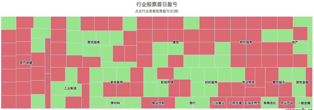 上图为按行业分类首日盈亏数量,医疗板块面积大,红色比例也大。居民服务、纺织服饰、原材料这都是坑人板块。