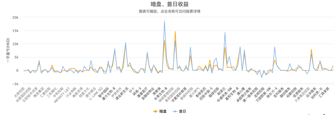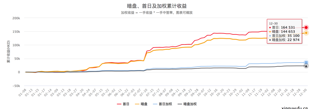 如果我们用一个白嫖账户,使用每票都参与的盲打一手现金策略,按中签率加权后的期望值计算,首日收盘价无脑卖出可累计获利3.5W,暗盘收盘价无脑卖出可累计获利2.3W。即使再扣除5%左右的摩擦成本,一户也有不少收益。