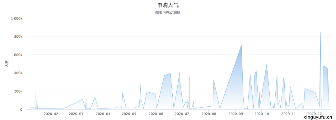 全年的参与人数,整体呈现逐步走高的态势,7月一波小高潮,9月又进一步提高,到年底创新高,预计明年会持续走高,突破百万人申购指日可待,2021年的百万人申购大概率会多次出现了。