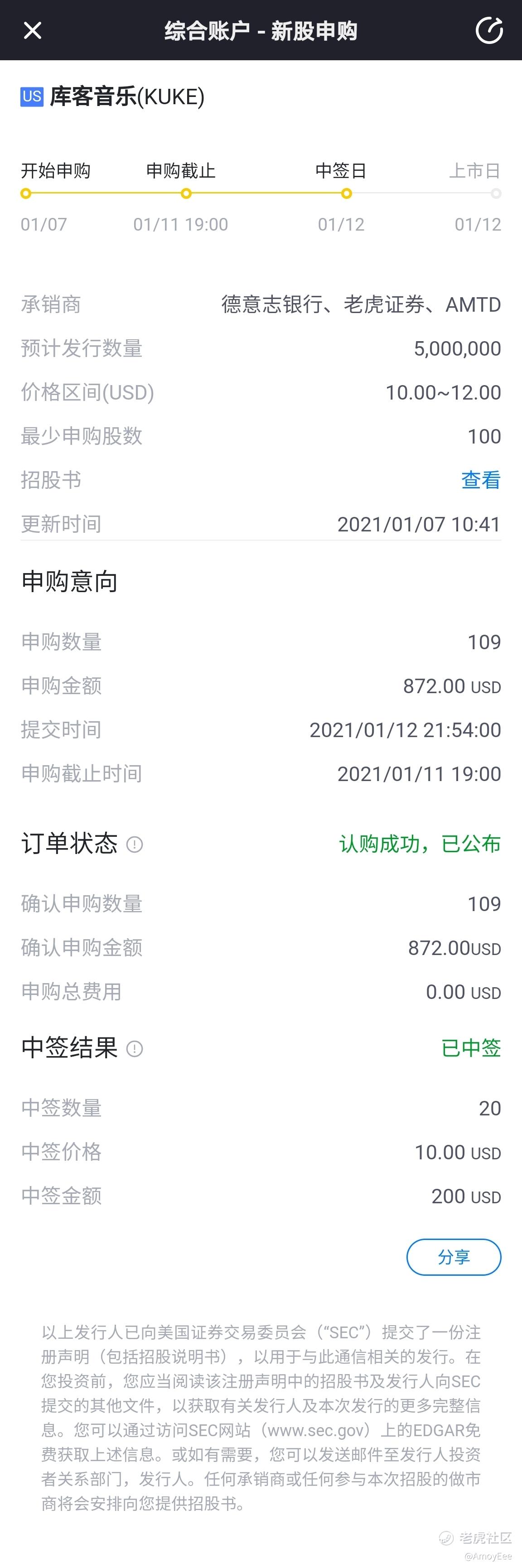 账户全部米用上,申购了109股,中了20股,祝大家2021好运来……