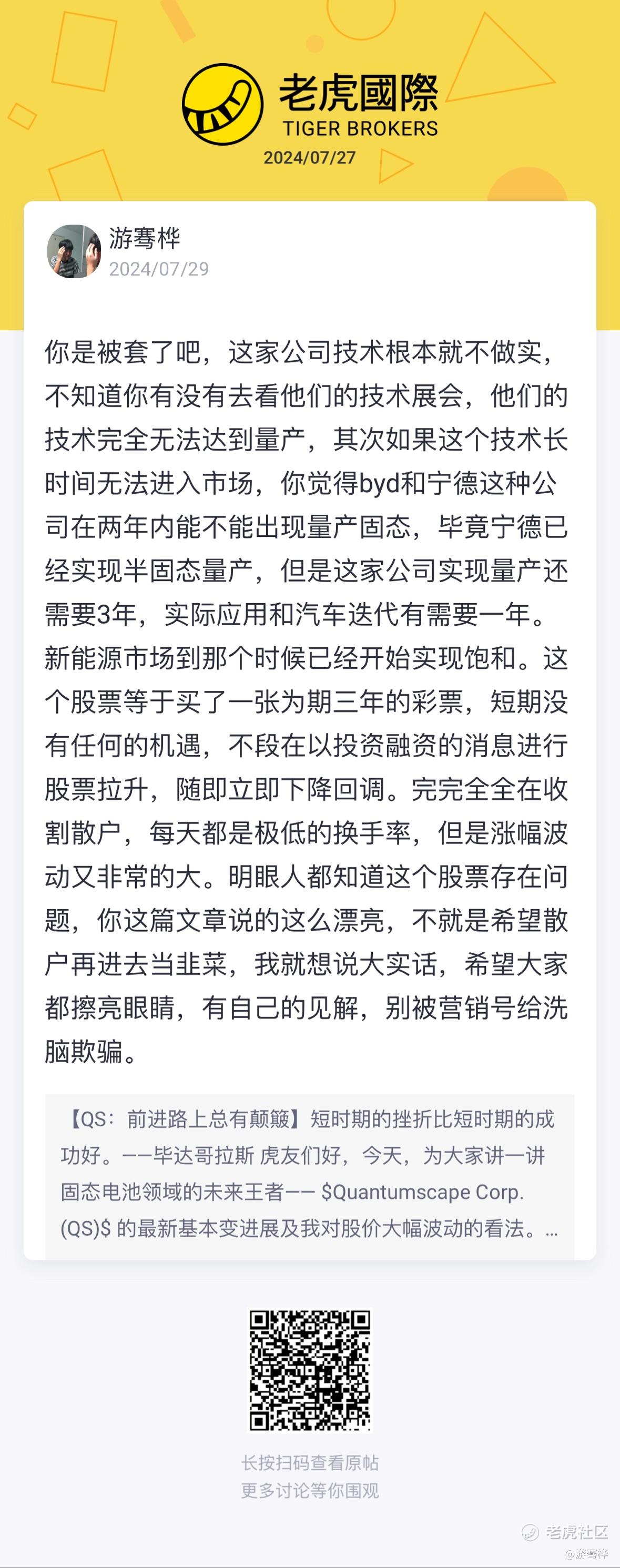 你是被套了吧,这家公司技术根本就不做实,不知道你有没有去看他们的技术展会,他们的技术完全无法达到量产,其次如果这个技术长时间无法进入市场,你觉得byd和宁德这种公司在两年内能不能出现量产固态,毕竟宁德已经实现半固态量产,但是这家公司实现量产还需要3年,实际应用和汽车迭代有需要一年。新能源市场到那个时候已经开始实现饱和。这个股票等于买了一张为期三年的彩票,短期没有任何的机遇,不段在以投资融资的消息进行股票拉升,随即立即下降回调。完完全全在收割散户,每天都是极低的换手率,但是涨幅波动又非常的大。明眼人都知道这个股票存在问题,你这篇文章说的这么漂亮,不就是希望散户再进去当韭菜,我就想说大实话,希望大家都擦亮眼睛,有自己的见解,别被营销号给洗脑欺骗。