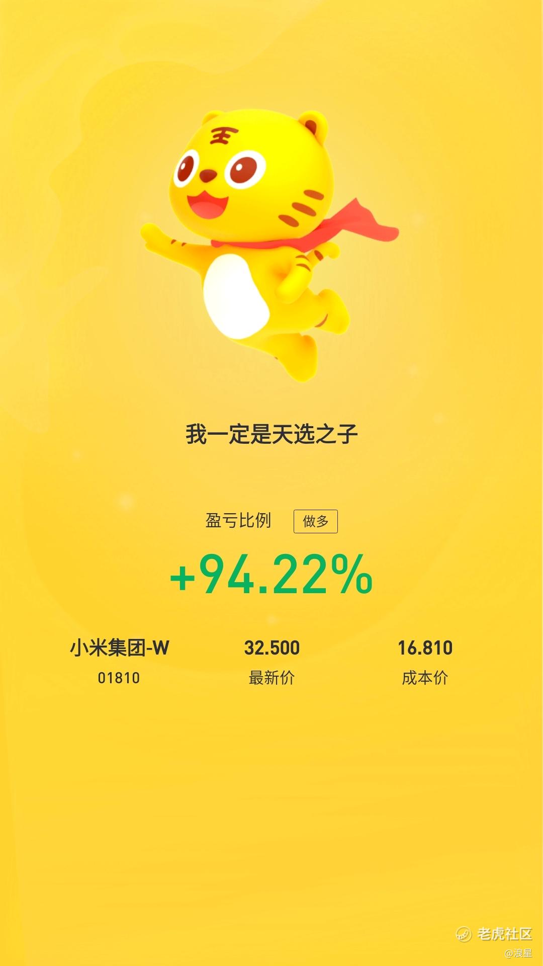我是小米粉,所以当得知小米要上市,就买下了年轻人的第一只股票,买港股还麻烦得很,钱也不多,每个月还要交账户管理费。。。 入坑后没几天就涨了 20% 多,高兴的很,也没想着卖了。后来就各种跌,各种斩,想加仓的时候,转账被银行拒绝了,真是难搞哦。后来也就不管了,但想着每月还要管理费,到时候会不会不够交管理费,也挺搞笑的。哈哈哈 没想到今年凸凸凸,真的翻倍了。这下欠的管理费可以交了。🤣🤣🤣