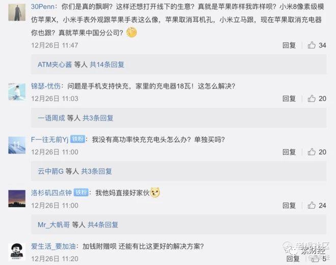“你们是真的飘啊?这样还想打开线下的生意?真就是苹果咋样我咋样呗?小米8像素级模仿苹果X,小米手表外观跟苹果手表这么像,苹果取消耳机孔,小米立马跟,现在苹果取消充电器你也跟?真就苹果中国分公司?”