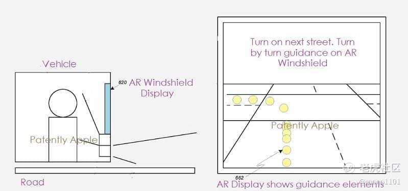 據美國專利局數據顯示,2017 年至今,蘋果汽車專利共獲得了 100 多項,其中,智慧駕駛系統專利佔比從 2016 年的 22% 上升至 2019 年的 41%,這顯然是要做自駕電動車,如下圖就是蘋果在前檔玻璃的 AR 專利。