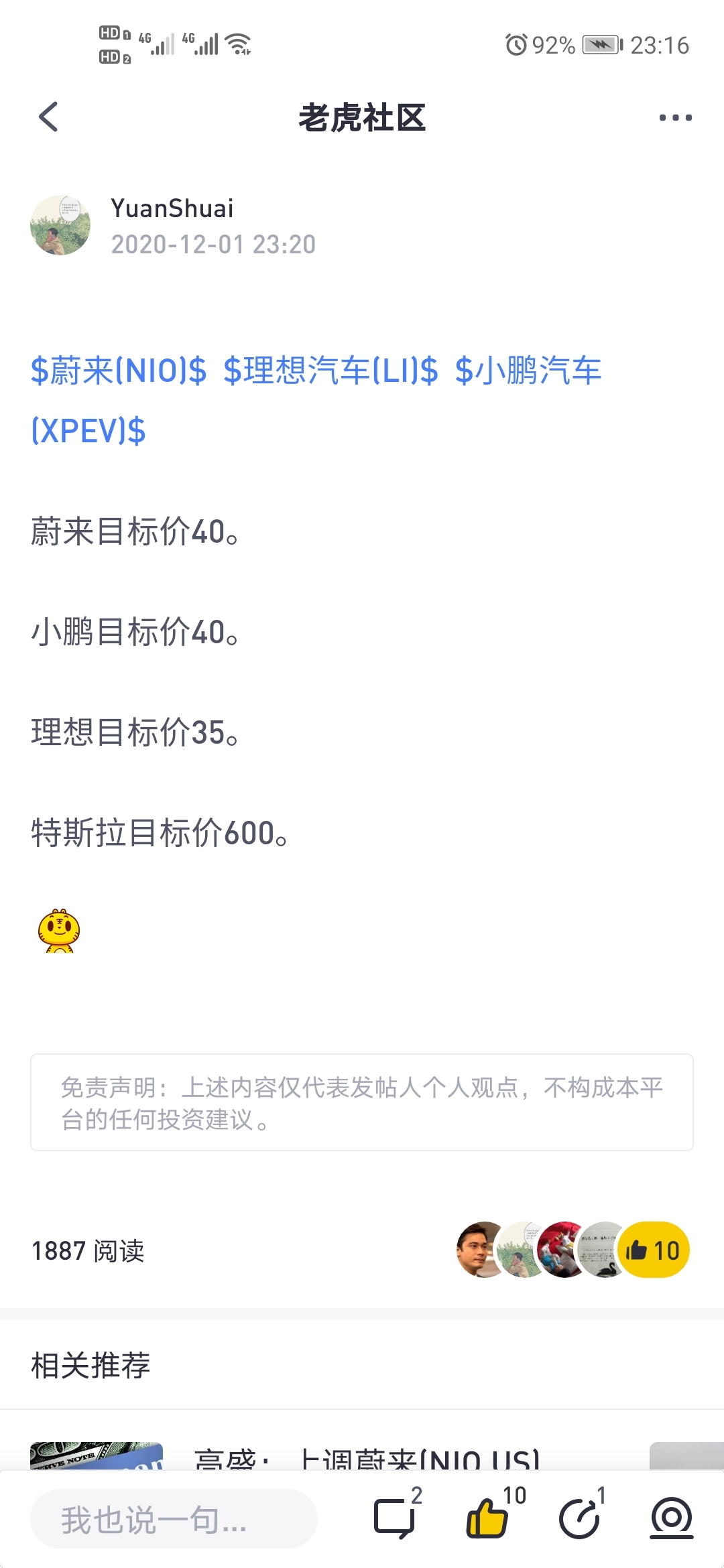 果然,这个月估值修正,特斯拉11月销量翻倍,股价直奔700。小鹏销量几乎没增长,12月很可能转跌,股价直接跳水。蔚来稳中有进,目前估值居中。理想我还是觉得被低估了,35块的价位可以有。[可爱]