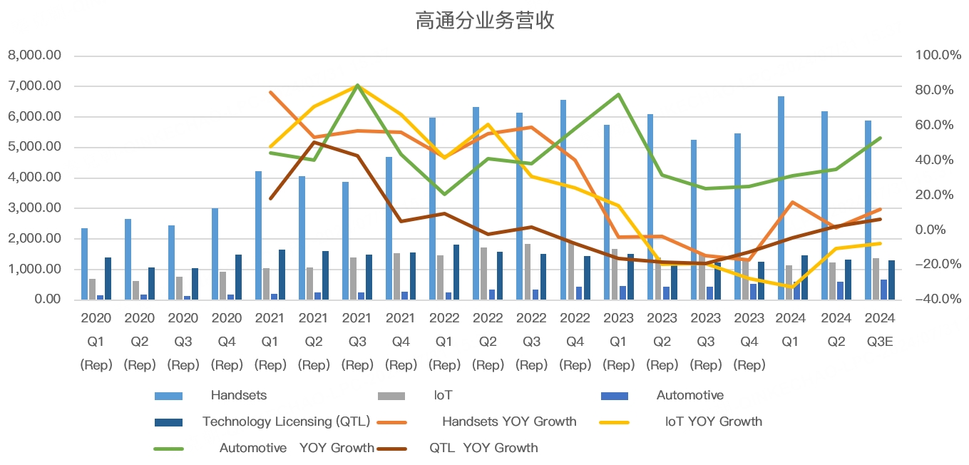 分部门看,分析师预期高通手机业务营收58.82亿,同比增长11.9%;预计IoT营收13.7亿,同比下滑7.7%;预计汽车芯片营收6.6亿,同比增长53%;预计技术授权收入13亿,同比增长6.3%: