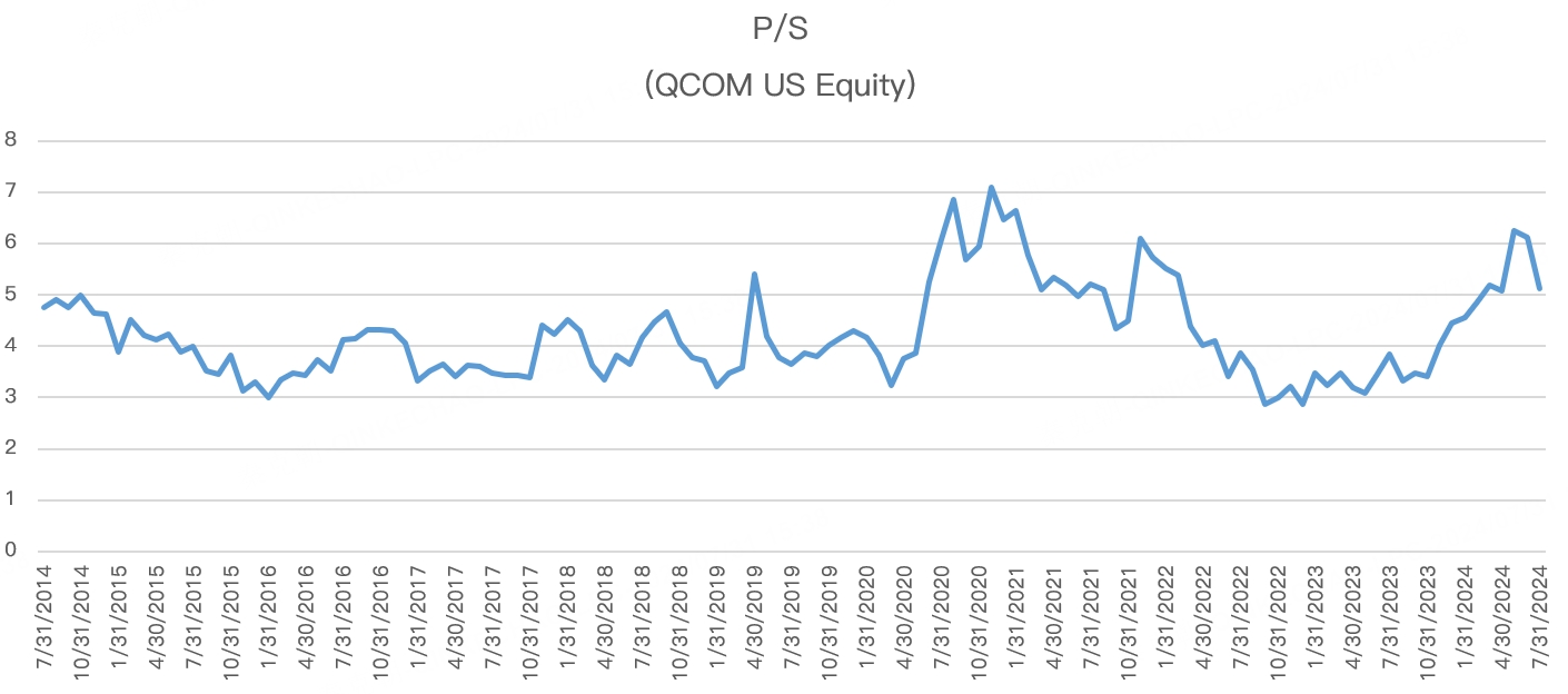 从估值上看,财报发布前,高通股价从高点回落较大,目前的市销率为5.1倍,低于上一轮景气周期时的7倍: