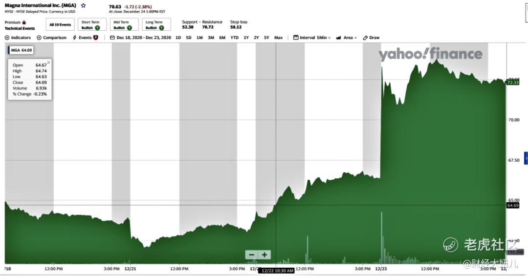 在这一消息的刺激下,麦格纳的股票(NYSE:MGA)本周初两天内从63.74美元跳升至72.50美元,足足涨了13.7%!