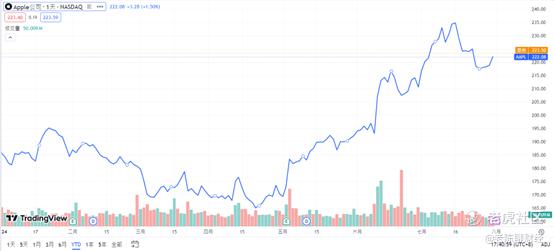 截止发稿时,苹果股票周三收盘上涨1.5%至222.08美金,而52周交易价格为164.08美金至237.23美金。2024年迄今苹果股票以上涨约13%。