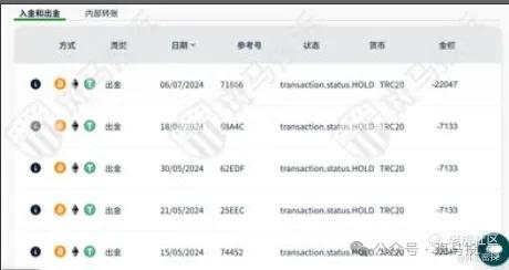 出金状态始终显示为“transaction.status.HOLD”,即处于挂起状态。