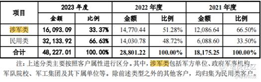 具体而言,2020年至2022年以及2023年上半年,涉军类业务占比分别为61.57%、66.5%、51.28%、33%。