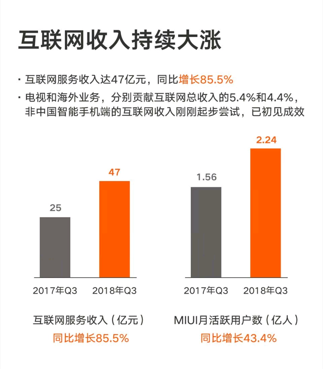 上市之前做的预测中有两个最大的变量:互联网收入和海外手机收入。一个撑起小米的净利润,一个撑起小米的出货量和收入。