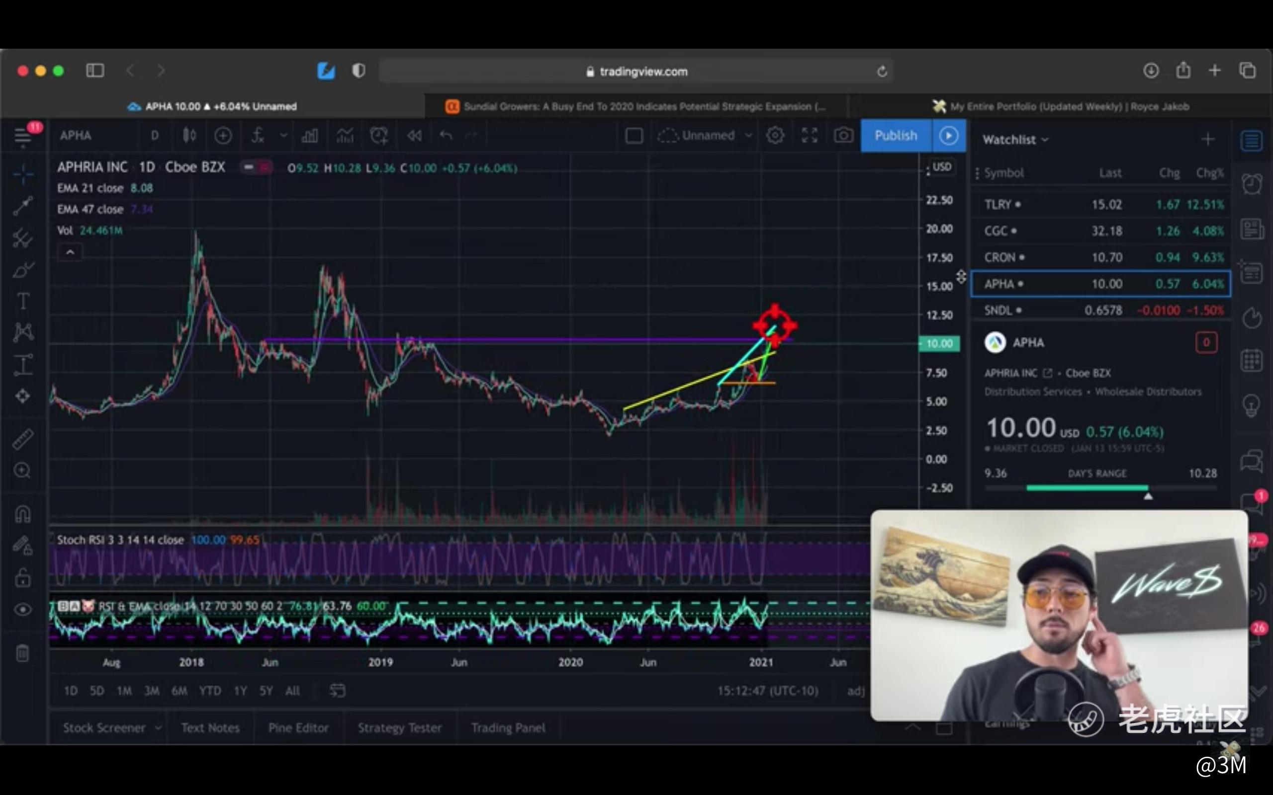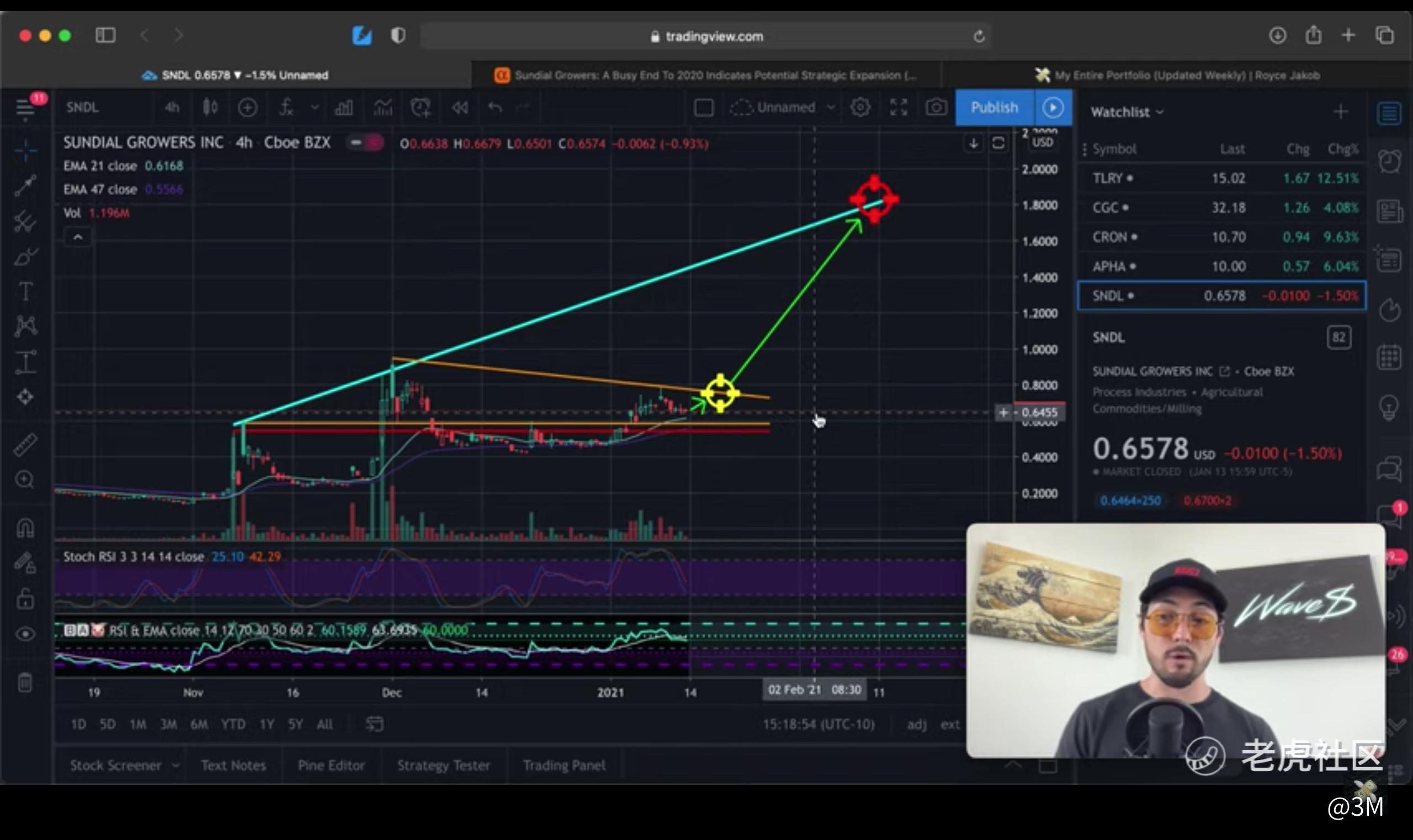 $Sundial Growers Inc.(SNDL)$兄弟们,我又来画图了!不过这次是搬运了老外几个小时前的分析。老外韭菜们和我们一样,我们心心念着SNDL,就看能不能突破这个点位了,破了未来无限可能。(还差两张图别的嘛股一会发出来。$Tilray Inc.(TLRY)$$奥罗拉大麻公司(ACB)$
