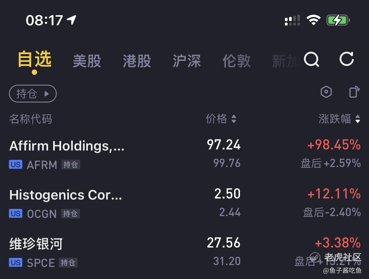 {"i18n":{"language":"zh_CN"},"detailType":1,"isChannel":false,"data":{"magic":2,"id":335636595,"tweetId":"335636595","gmtCreate":1610583607717,"gmtModify":1703745378180,"author":{"id":3493426794200465,"idStr":"3493426794200465","authorId":3493426794200465,"authorIdStr":"3493426794200465","name":"鱼子酱吃鱼","avatar":"https://static.tigerbbs.com/1a127632617c148437c5447d9880bc19","vip":1,"userType":1,"introduction":"","boolIsFan":false,"boolIsHead":false,"crmLevel":1,"crmLevelSwitch":0,"individualDisplayBadges":[],"fanSize":9,"starInvestorFlag":false},"themes":[],"images":[{"img":"https://static.tigerbbs.com/327b7030a901a375ac1dc2fd75666082","width":"1242","height":"939"}],"coverImages":[{"img":"https://static.tigerbbs.com/327b7030a901a375ac1dc2fd75666082","width":"1242","height":"939"}],"extraTitle":"","html":"<html><head></head><body><p><a href=\"https://laohu8.com/S/SPCE\">$维珍银河(SPCE)$</a><a href=\"https://laohu8.com/S/AFRM\">$Affirm Holdings, Inc.(AFRM)$</a><a href=\"https://laohu8.com/S/OCGN\">$Histogenics Corporation(OCGN)$</a>真是趁着我睡觉轮流唱大戏呢</p><img src=\"https://static.tigerbbs.com/327b7030a901a375ac1dc2fd75666082\" tg-width=\"1242\" tg-height=\"939\"></body></html>","htmlText":"<html><head></head><body><p><a href=\"https://laohu8.com/S/SPCE\">$维珍银河(SPCE)$</a><a href=\"https://laohu8.com/S/AFRM\">$Affirm Holdings, Inc.(AFRM)$</a><a href=\"https://laohu8.com/S/OCGN\">$Histogenics Corporation(OCGN)$</a>真是趁着我睡觉轮流唱大戏呢</p><img src=\"https://static.tigerbbs.com/327b7030a901a375ac1dc2fd75666082\" tg-width=\"1242\" tg-height=\"939\"></body></html>","text":"$维珍银河(SPCE)$$Affirm Holdings, Inc.(AFRM)$$Histogenics Corporation(OCGN)$真是趁着我睡觉轮流唱大戏呢","highlighted":1,"essential":1,"paper":1,"likeSize":7,"commentSize":0,"repostSize":0,"favoriteSize":0,"link":"https://laohu8.com/post/335636595","repostId":0,"isVote":1,"tweetType":1,"viewCount":2204,"commentLimit":10,"likeStatus":false,"favoriteStatus":false,"reportStatus":false,"symbols":["AFRM","SPCE","OCGN"],"verified":2,"subType":0,"readableState":1,"langContent":"CN","currentLanguage":"CN","warmUpFlag":false,"orderFlag":false,"shareable":true,"causeOfNotShareable":"","featuresForAnalytics":[],"commentAndTweetFlag":false,"andRepostAutoSelectedFlag":false,"upFlag":false,"length":99,"xxTargetLangEnum":"ZH_CN"},"commentList":[],"isCommentEnd":true,"isTiger":false,"isWeiXinMini":false,"url":"/m/post/335636595"}