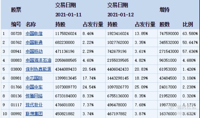 以1月12日为例,港股通增持股数最多排名中,联想集团一跃排进前十,获增持450821882股,占发行量的3.74%。