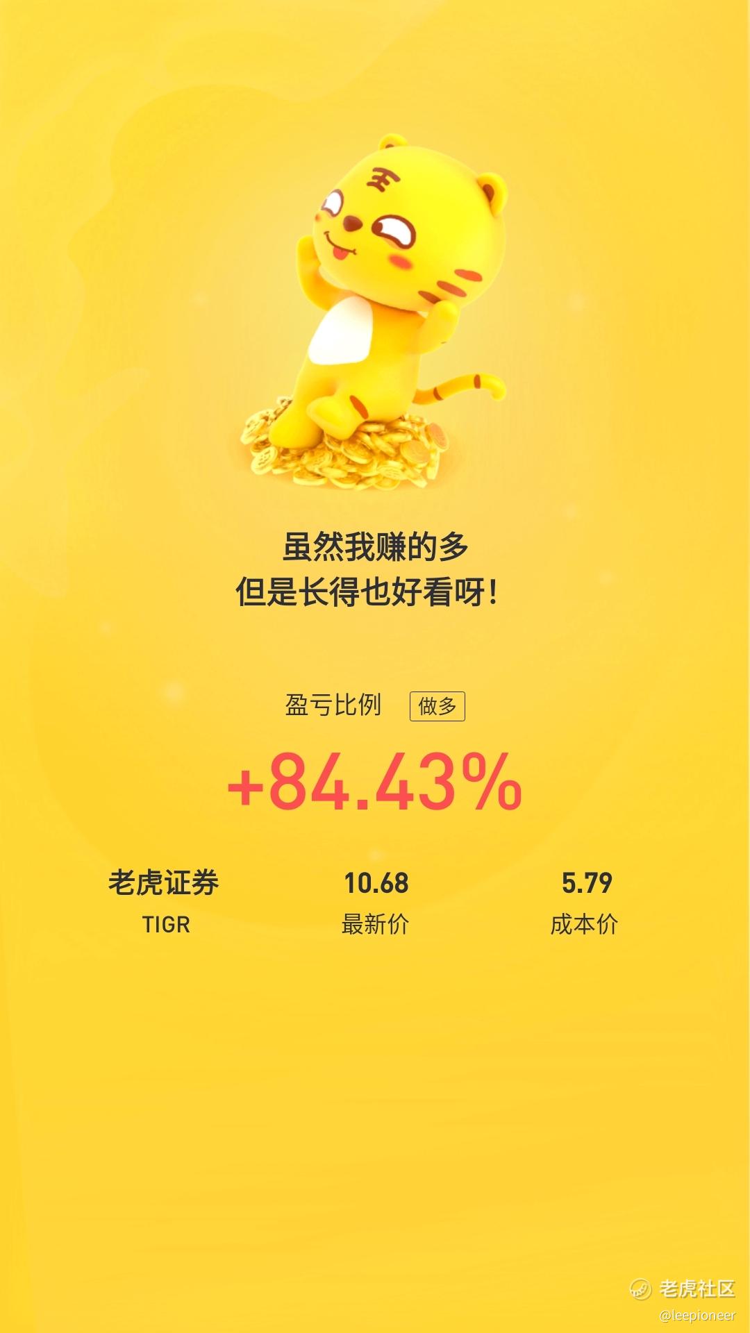 老虎从亏20%多,到财报前涨22%多,再到亏,再到现在84%多,穿越牛熊。炒股也是修炼自身的一种特殊方法~