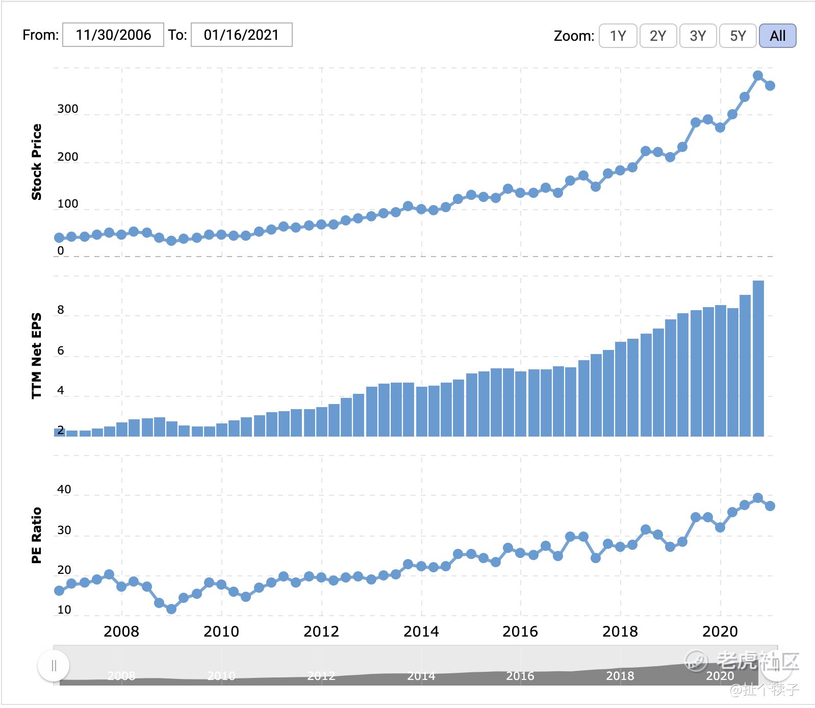 近期,公司的股价从2020年12月份最高点的393美元跌至了当前的350美元左右,我认为是由于市场上很多耐不住寂寞的投机者将热钱都转移到了那些疯涨的科技股上(比如$特斯拉(TSLA)$ ,这仨字儿最近真的有点看烦了…),而在短期内放弃了稳健的传统股。