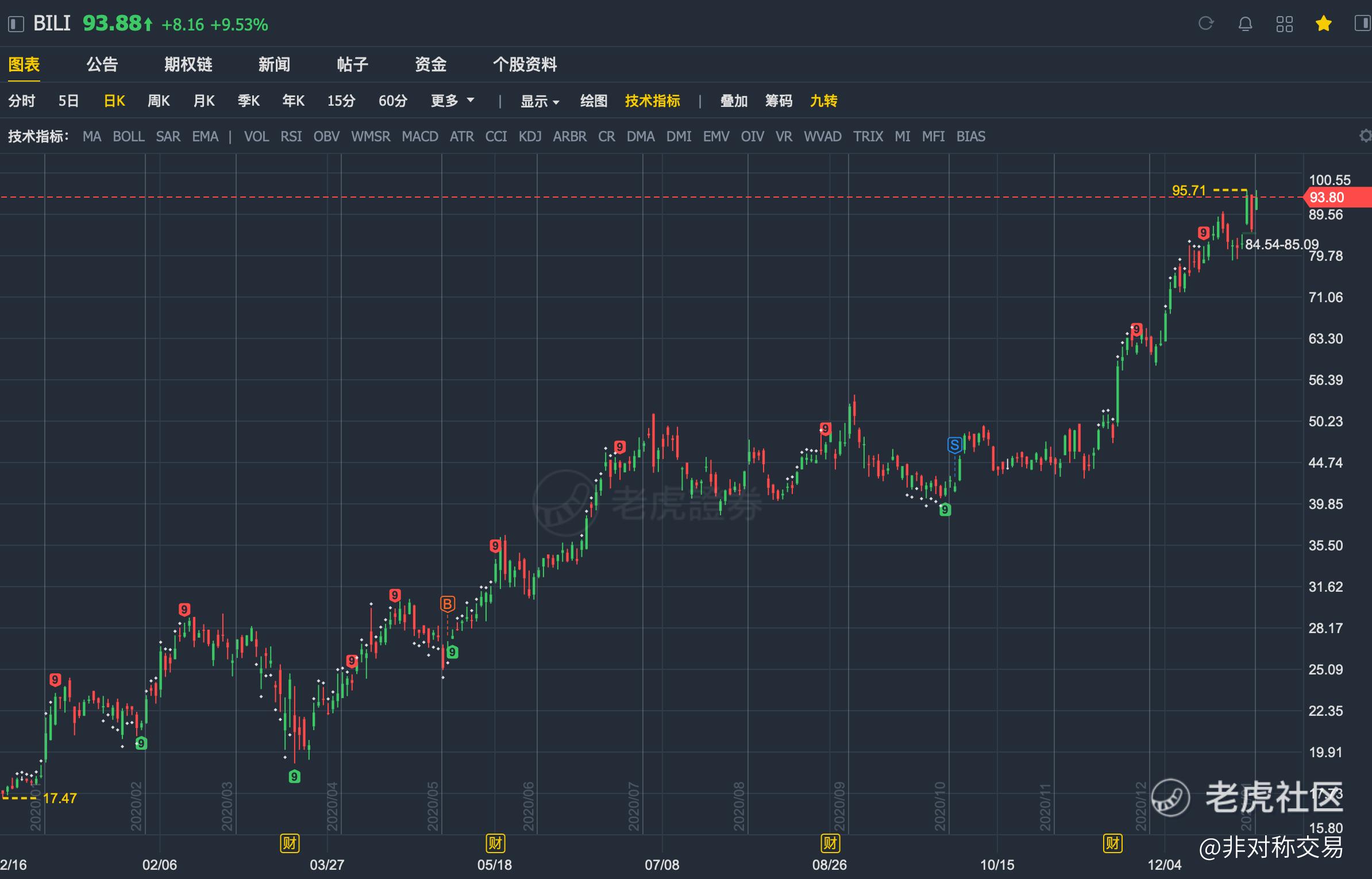 2020年的美股在年初经历了4次熔断,连股神巴菲特都直呼活久见之后,一路逆袭,对大家不薄,是个大牛年。$哔哩哔哩(BILI)$ 从16.82美金(2019年12月31日收盘价)一路上涨到了85.72美金(2020年12月31日收盘价),涨幅达410%。而B站CEO陈睿的目标仅仅是2020年实现B站跨入百亿美金俱乐部,通过一系列破圈之后,B站的目前的市值达到了300亿美金,从小破站终于成长为一个广告客户、巨头都不得不重视的存在。比对标$Netflix, Inc.(NFLX)$ 的$爱奇艺(IQ)$ 高出不少。