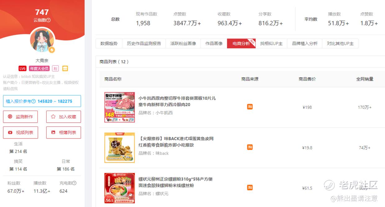 简介里写明自己是“日更营销号”的大霓奈,目前拥有67万粉丝,官方认证为知名搞笑UP主,且其已与B站直播签约。搬运视频积攒人气,直播真人出镜与网友互动,大霓奈已进行过多次商业变现活动。