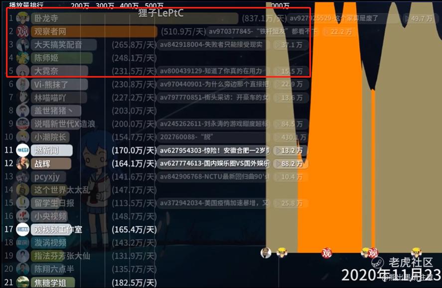 网友狸子LePtC整理的播放数据也能证明营销号在B站的野蛮生长。例如11月23日这一天,全站播放量排名前五的UP主,第一卧龙寺、第四陈师姬和第五大霓奈,搬运营销号占了三席。