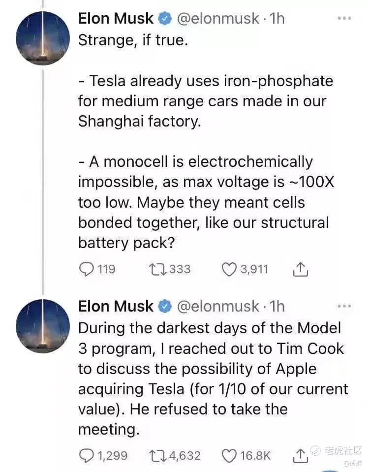 然后他接着补发了一条推,说“当年特斯拉最黑暗的日子,感觉实在撑不住了,打算以当前市值十分之一的价格卖给苹果,但是提姆库克他不理我”。