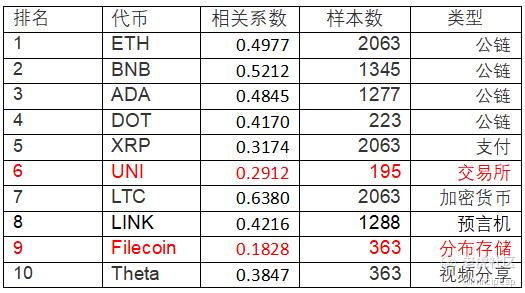 一切似乎都还算正常,除了Filecoin和Uni,其他项目都和比特币行情保持了相当的相关程度。其中同为加密货币的莱特币更是有着0.6的强相关。其他公链的相关性也都在0.4到0.5左右,币安的相关性更是超过了0.5,达到了强相关。