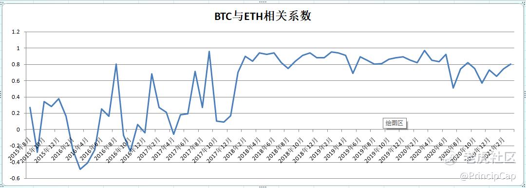 非常有意思的是,2014年上线的以太坊并不是一直都和比特币保持步调一致的。即使是2015年,0.2的相关系数也很弱。总体而言,两者的关系更像是在处“父子”,在以太坊一点点“长大成熟”的过程中一点点向比特币靠拢。在2018年之后,两者明显的开始展现出很高的相关性。