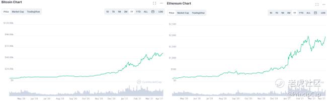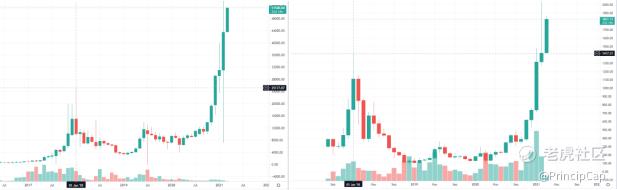 我们找出了CMC上最近的一年以太坊(下左图)和比特币(下右图)的价格变化图,两者也几乎就是同一种走势。