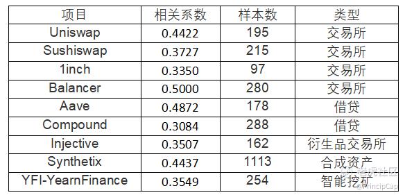 而从以太坊项目总体来看,都表现出和以太币中等程度的相关性。其中,Balancer更是“迈进了”强相关的门槛。反之,Compound虽然相关性较弱,但也达到了0.3,也算是中等相关了。