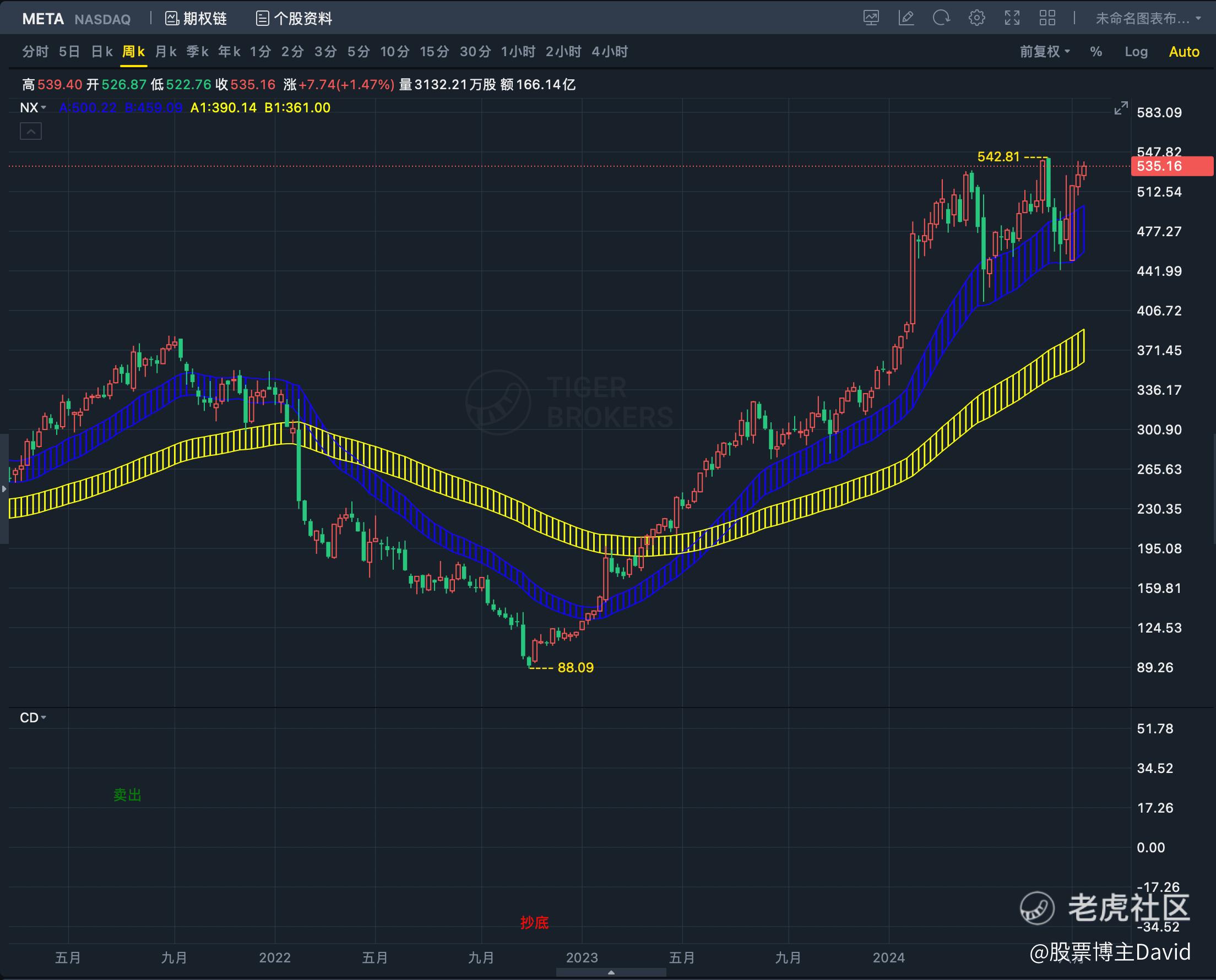 meta你就按照我说的来。你可以翻看我过去的解读,我都说了一年多了。CD指标提示抄底之后,只要蜡烛图收盘价不低于蓝色梯子下边缘,meta会一直涨: