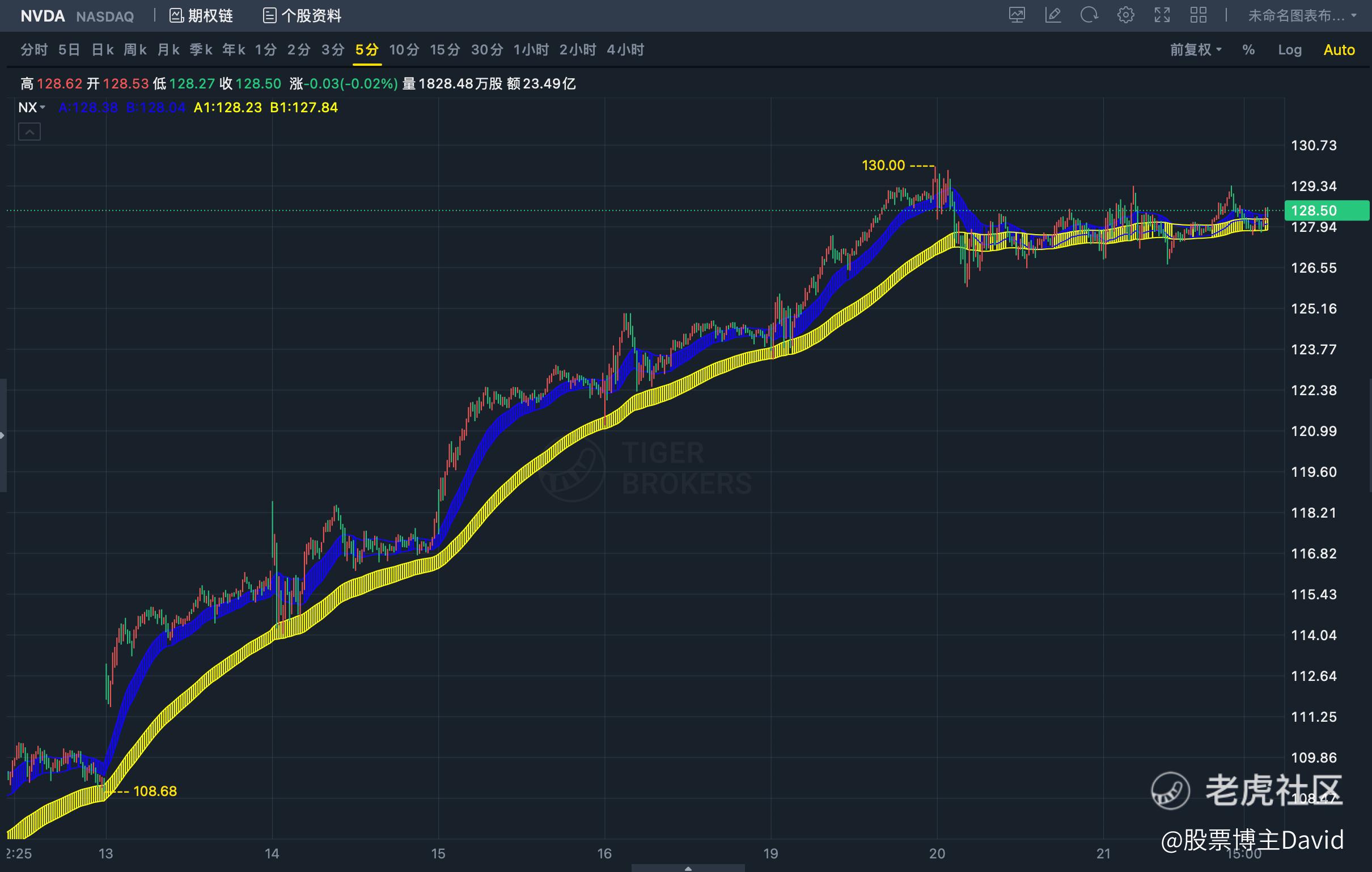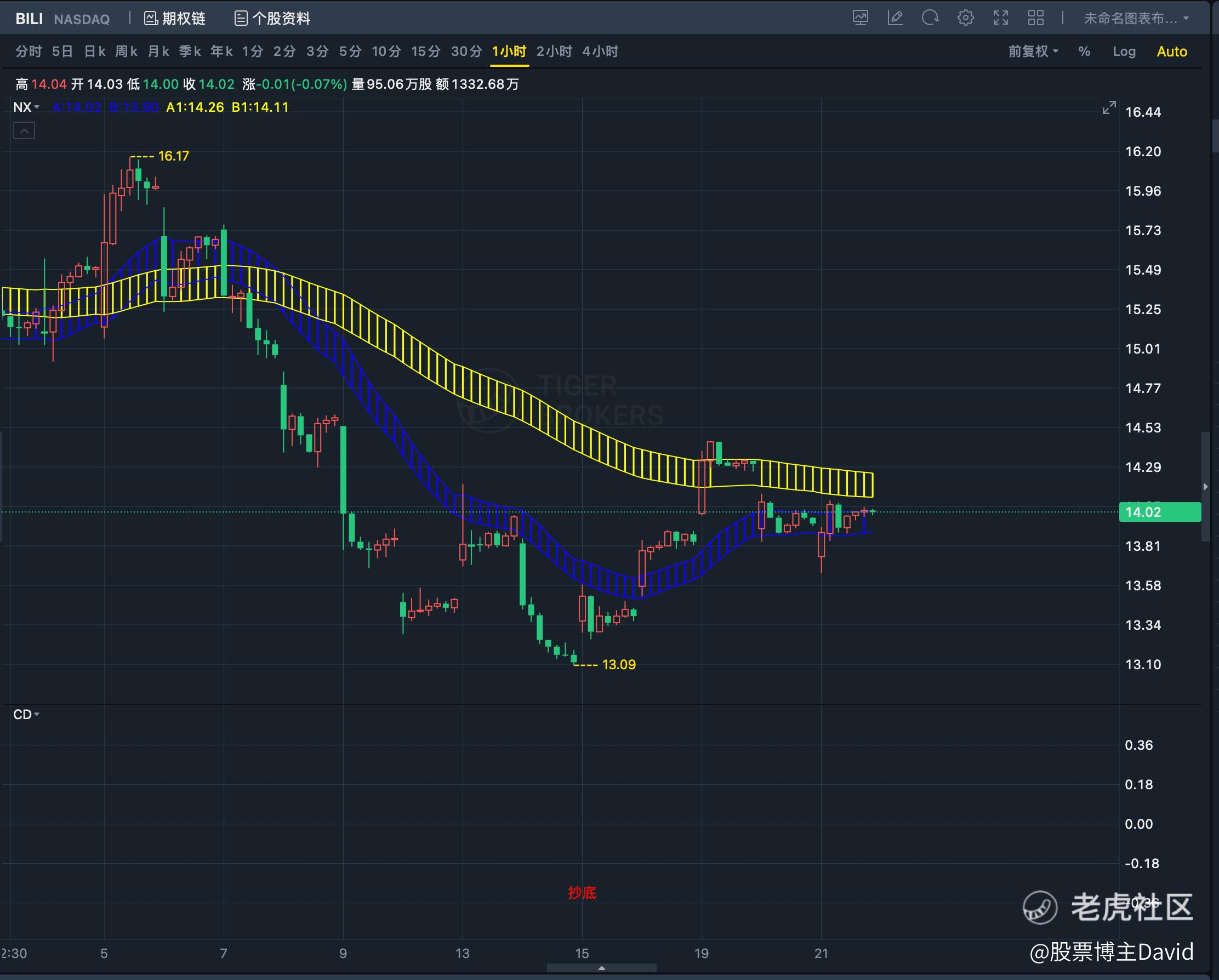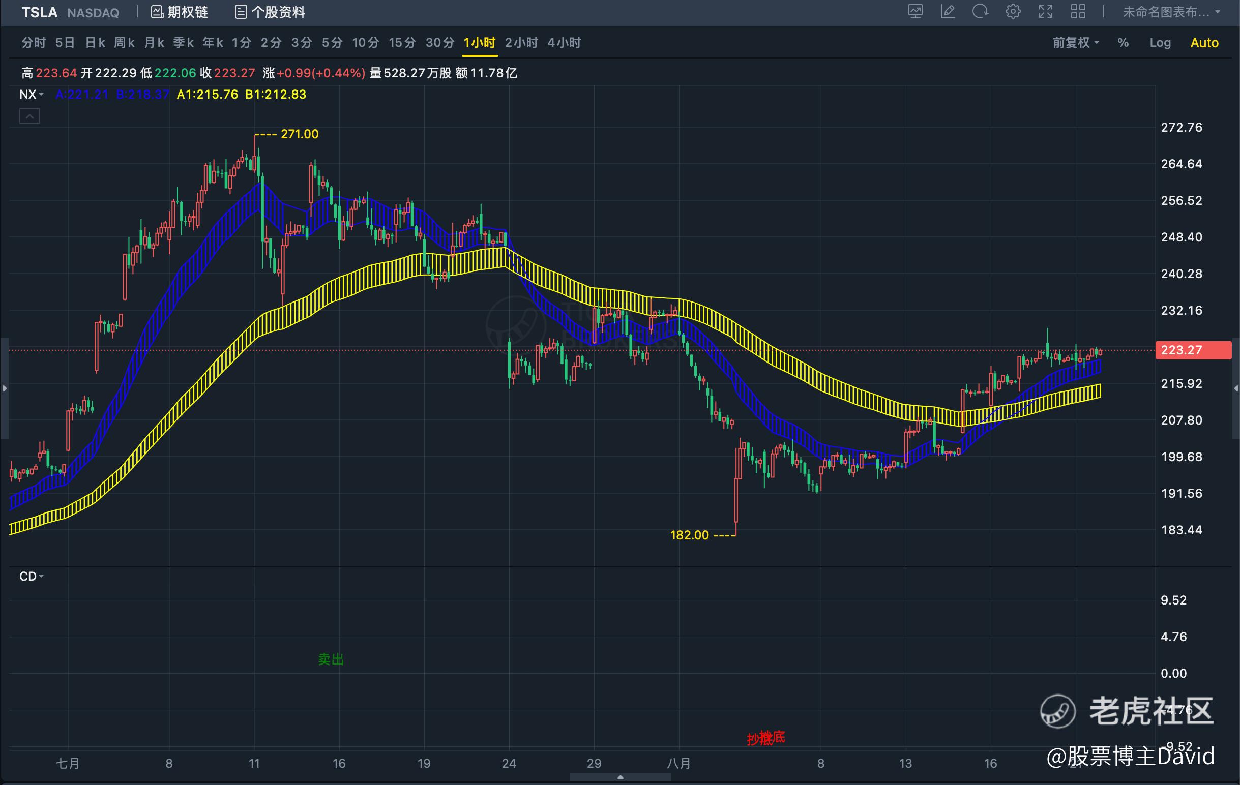 最后,说下特斯拉。我们定好了技术规则,一小时级别CD指标提示抄底之后,现在蓝色梯子向上,不破蓝色梯子下边缘不卖出: