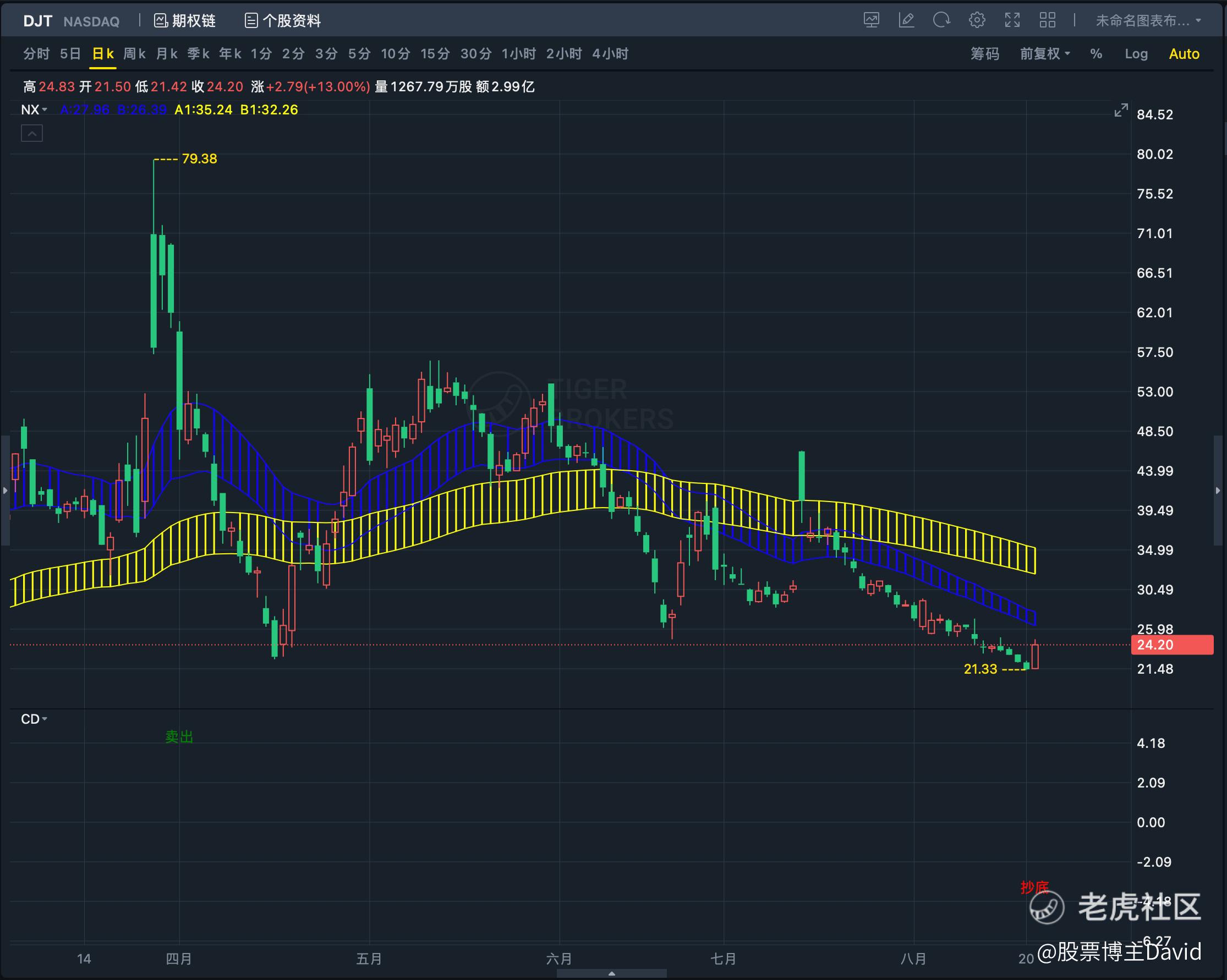 过去一周,我们解读视频每天都在提醒,日级别CD指标提示抄底,DJT就会有大机会。我昨晚的解读视频也说了,出现了。而且也贴了收益图,这一波要是涨的快,估计有10万刀。现在出的抄底,跟4月初的卖出呼应了: