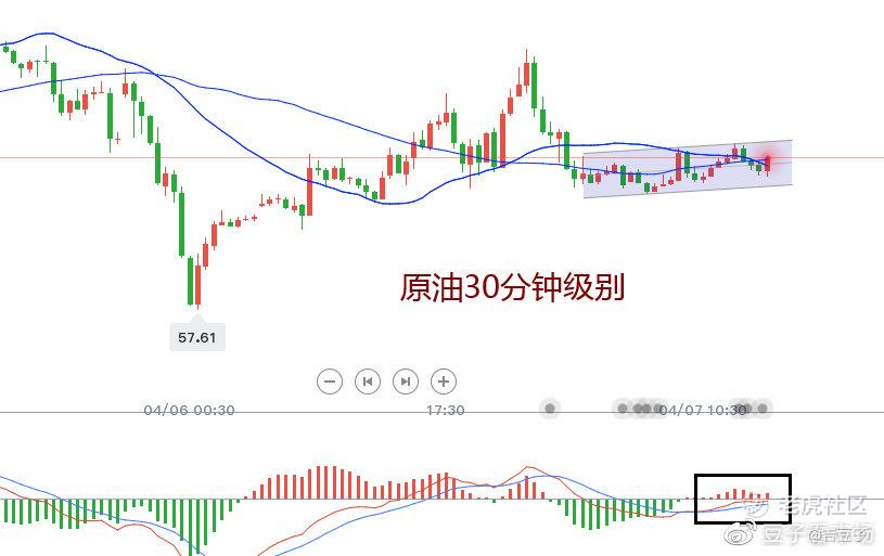 从30分钟级别看来,macd还有多头动能的存在,并且k线现在处于一个略微上行的通道,今天日内建议的短多看到60.5也是为后续做空做准备,毕竟日线中60.5差不多是见顶的位置,在这之后可以放心空了。