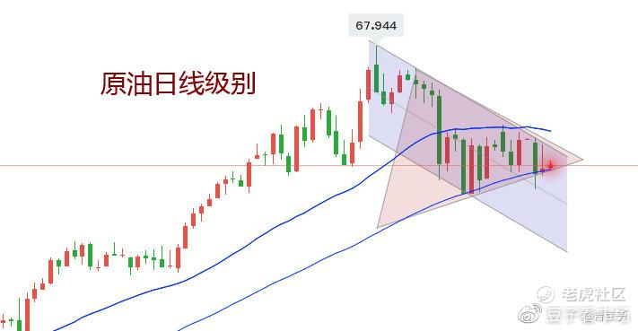 原油日线中现在走的三角形结构,上边线为下行区间上限,下边线为MA60均线支撑,随着三角形延伸,空间范围越来越小,可以确定破位就在这两天了。之前的文章和视频不止一次提到现在大周期看跌,但k线多次测试下行通道的上限,还是有突破的可能,因此现在在等的就上行破位。