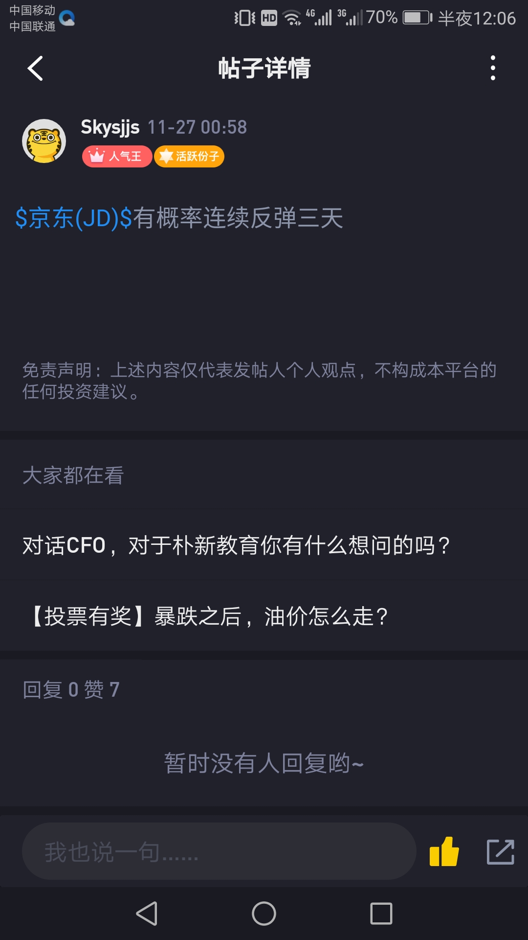 不过是有前提的,没人能预测未来,得看纳指给不给力了。如果纳指能涨1% ,京东基本妥妥到21.5。反之,如果大盘反转划水,就很悬。
