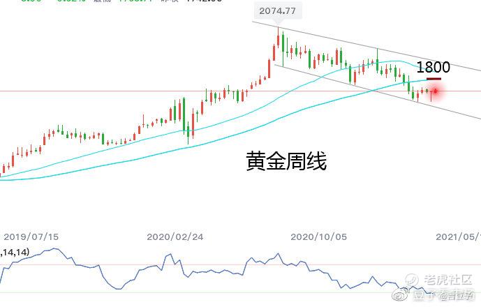 先来看下大周期。图为黄金周线,之前直播或者文章都说到过,虽然自高点2074之后整体都处于下行区间,但在区间下半部分逗留得有些久了,现在的均线系统结合布林带看上行空间都是很大的,1800不是梦。且RSI处于超卖区,现在黄金整体都是处于低位的,上到1800在周线看来不过是回调到常态区间罢了。