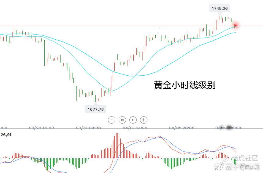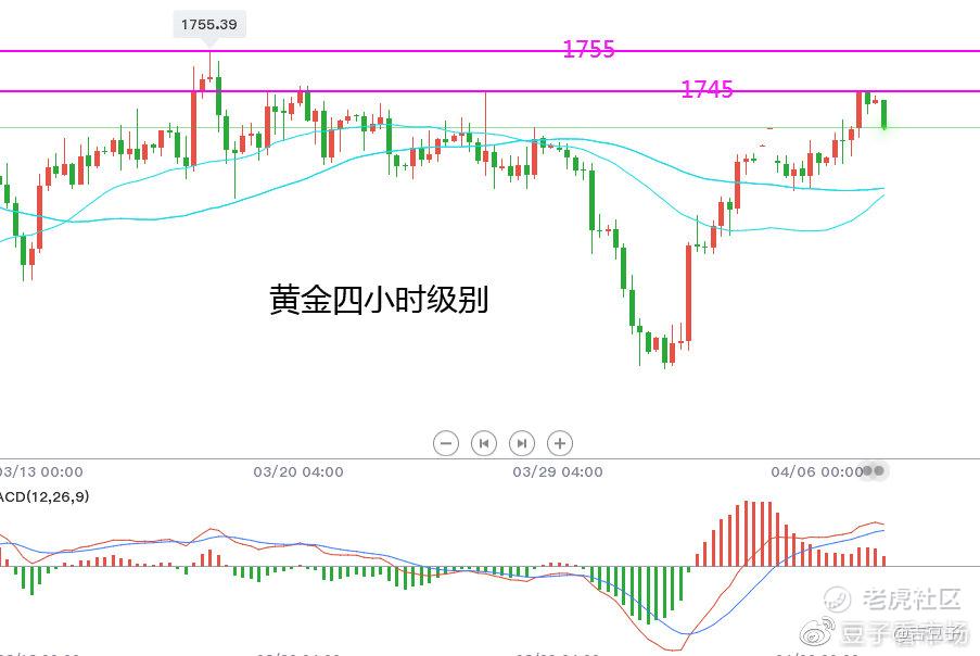 图为黄金四小时级别,两条线为1745和1755,看过昨晚视频的朋友会知道,我将这10美元的范围视为分水岭,破55后会继续上看,但破不了就还是要高位做空,45我没有建议空,现在是在等低点继续多,目标还是45,既然第一次能到,那肯定就能有第二次。macd可以看到从底部1678反弹初始,多头动能一度达到峰值,因此破1700的时候非常过瘾,之后动能不足,却维持放量,因此后续的上涨有些纠结,出现了多次回踩,只有下来蓄力才能继续发力上行,这波动能虽然不足,但是却很稳。这部分来说的确会让多头更有信心,