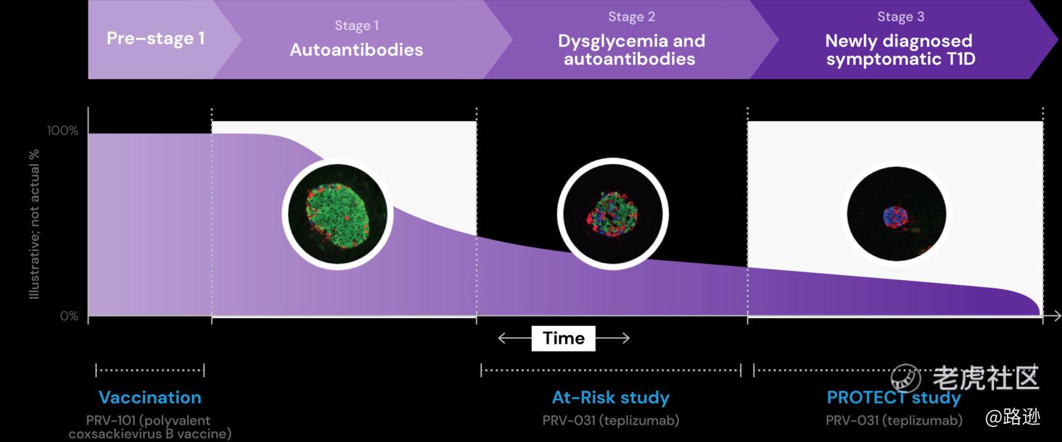 我印象里,T1DM,一般认为是先天性为主,发病率远低于T2DM,大概是DM中的5%以下。PRVB官网上说,With ~300K people living with preclinical T1D in the United States alone。T1DM一般在儿童或青少年期发病,标准治疗是终身使用胰岛素泵。去年我看了部好莱坞灾难片,男主角被选中进美国政府的避难所,儿子大概是T1DM,随身带了胰岛素泵,胰岛素药剂丢了。最后一家人都没能进避难所。这个电影的细节大概是真实的。下图是PRVB对T1DM的pre-stage 1、stage 1、stage 2(血糖代谢异常和自身抗体)和stage 3(新诊断、有症状的1型糖尿病)的干预。我本人是肝胆胰外科专业的,对T1DM有理论认识、没有临床管理经验。PRV-101针对pre-stage 1、PRV-031针对stage2和stage3。这个研究思路没毛病,逻辑上是自洽的。PRVB采用的这个T1DM发病3阶段,对于没有医学知识的人,是比较容易引起混淆的,非医学专业者可忽略此段。